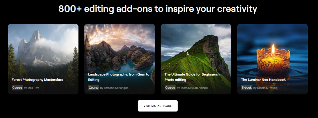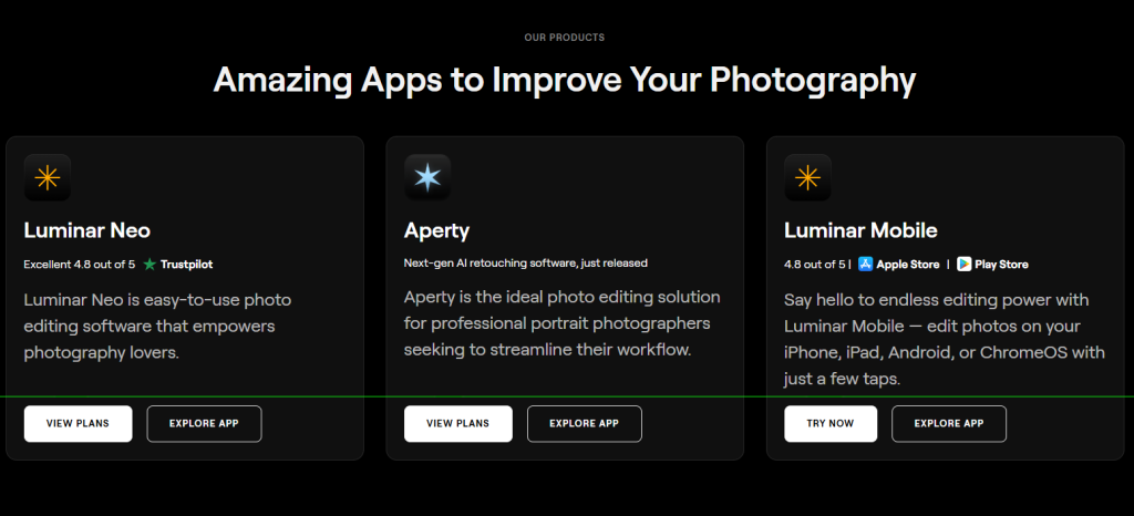 När du besöker Skylum möts du av ett tydligt utbud av programvara och resurser för fotografer och kreatörer. Här kan du hitta: