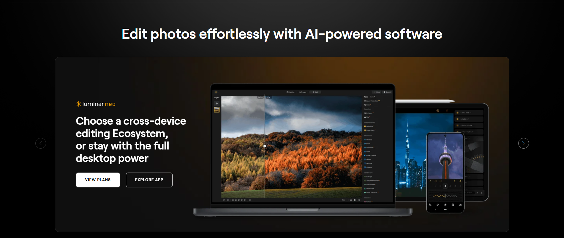 När du besöker Skylum möts du av ett tydligt utbud av programvara och resurser för fotografer och kreatörer. Här kan du hitta: